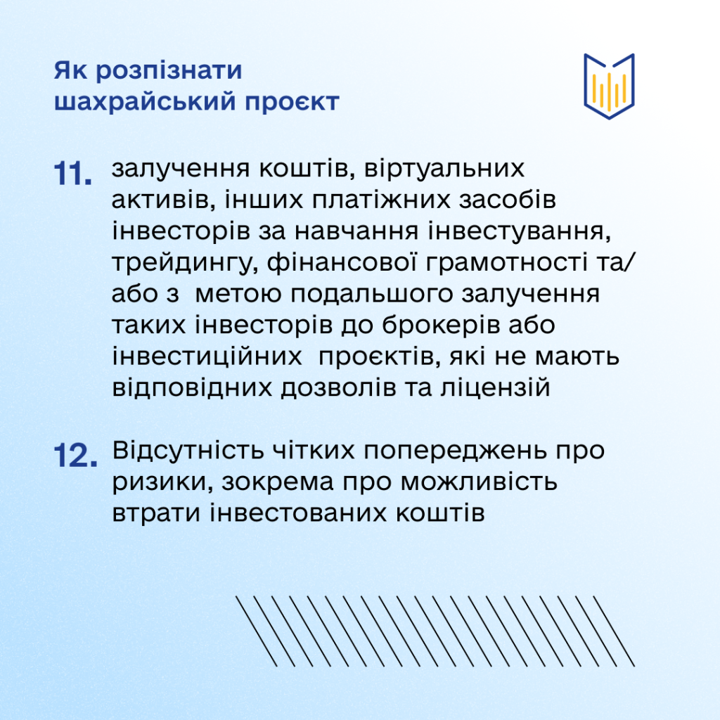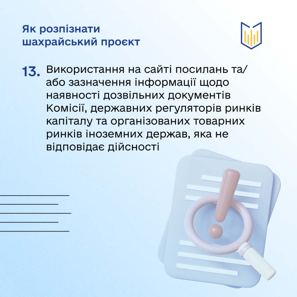 Детальніше ці ознаки пояснені в інфографіці Комісії. Закликаємо інвесторів не ігнорувати застереження та обирати лише перевірені інвестиційні проєкти.